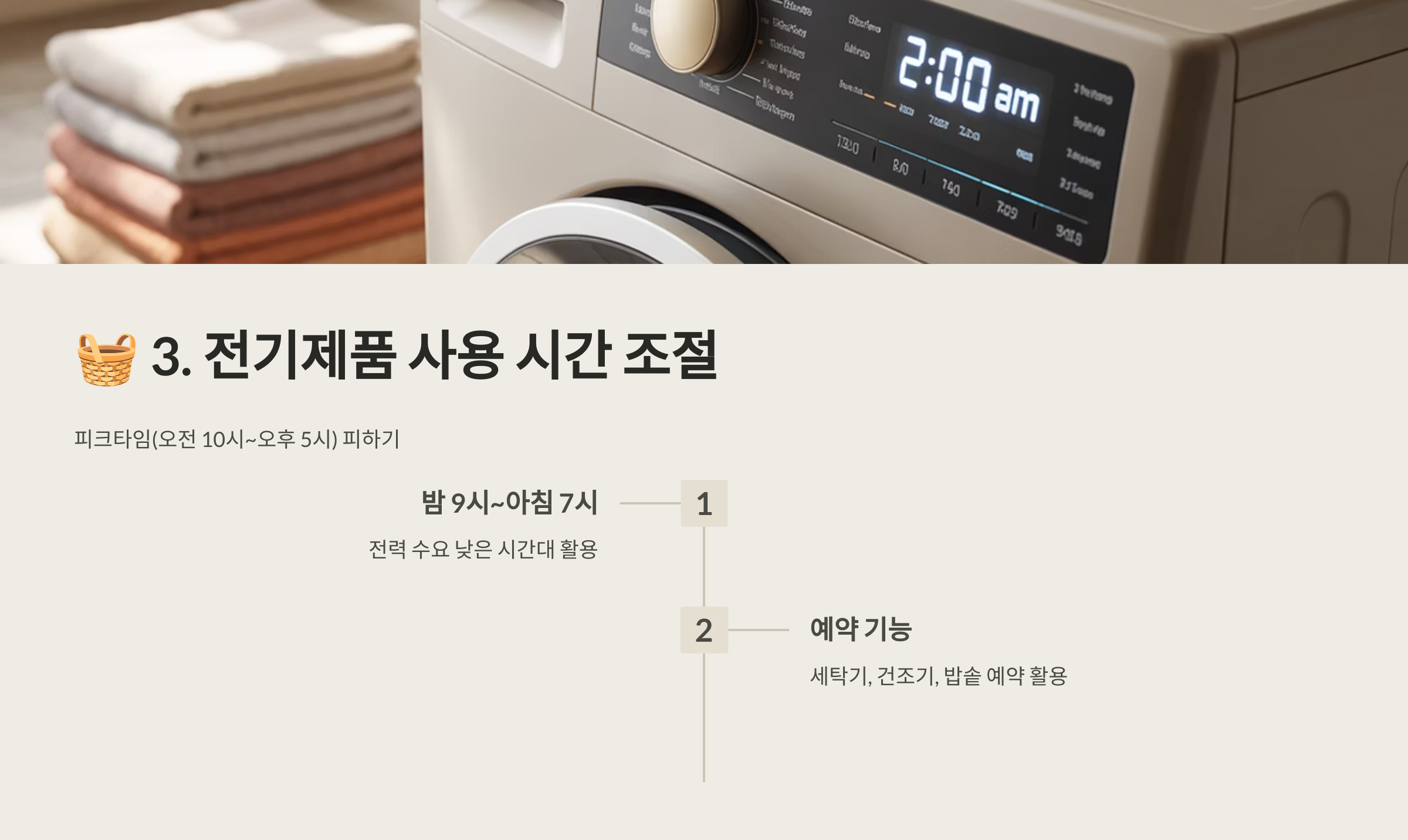 세탁기, 건조기, 밥솥 사용 시간을 피크타임(오전 10시~오후 5시)을 피해보세요.