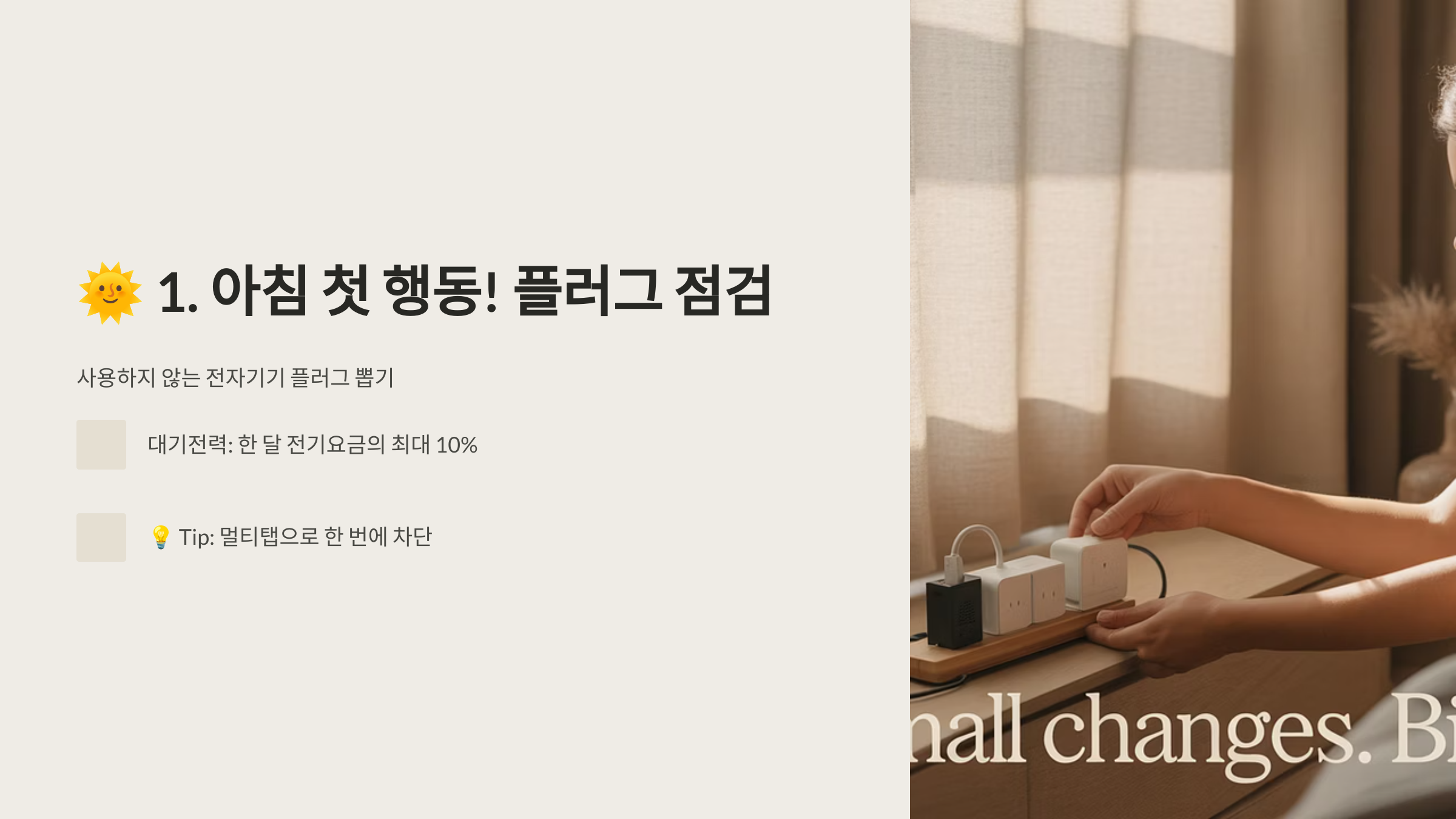 하루를 시작할 때, 사용하지 않는 전자기기의 플러그를 뽑아주세요.