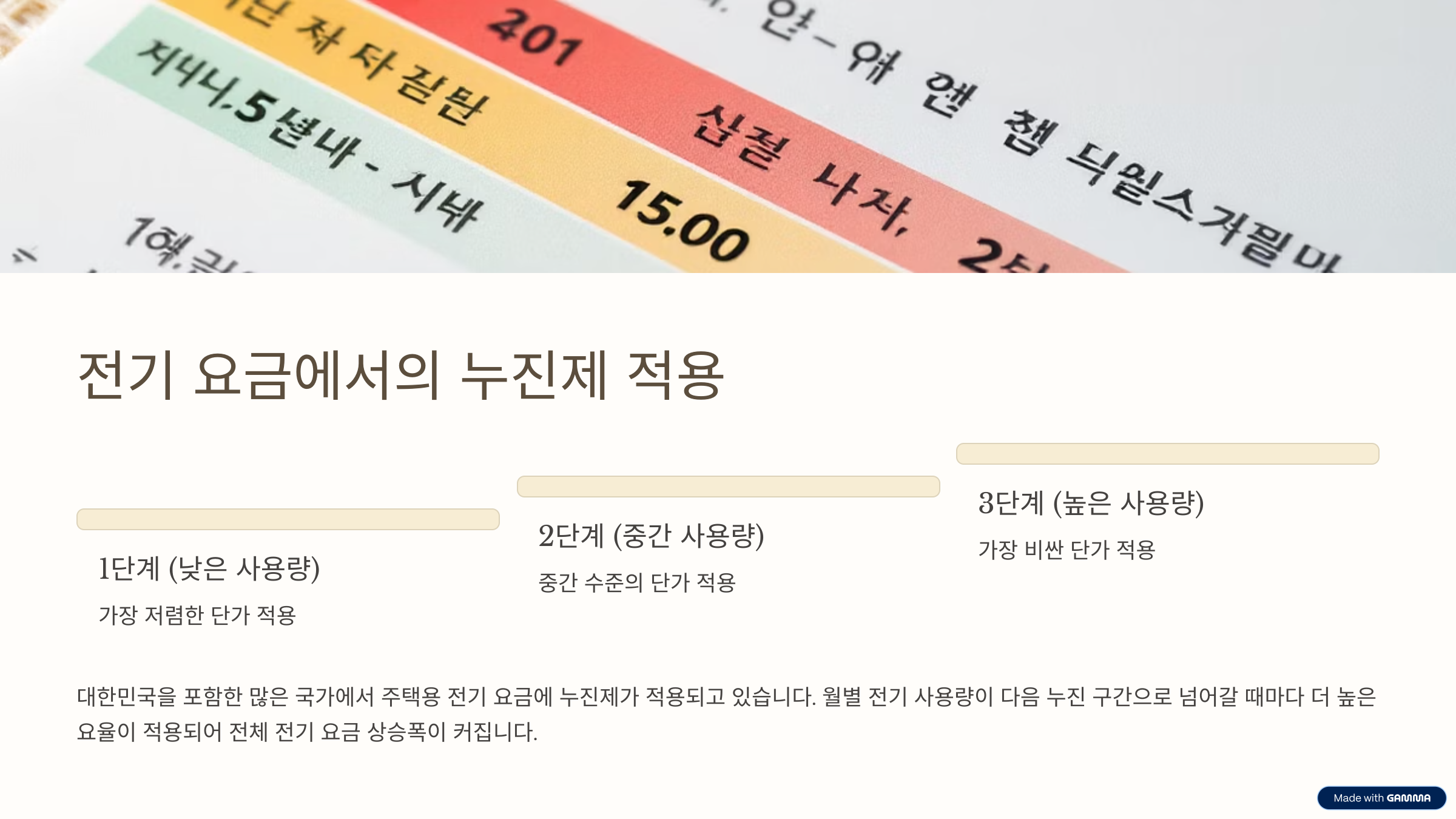 대한민국을 포함한 많은 국가에서 주택용 전기 요금에 누진제가 적용되고 있습니다. 이는 사용량을 여러 단계(누진 구간)로 나누고, 각 단계마다 다른 단가(kWh당 요금)를 적용하는 방식입니다. 예를 들어, 1단계(낮은 사용량 구간)에서는 저렴한 단가를, 2단계(중간 사용량 구간)에서는 중간 단가를, 3단계(높은 사용량 구간)에서는 가장 비싼 단가를 적용하는 식입니다. 따라서 월별 전기 사용량이 다음 누진 구간으로 넘어갈 때마다, 해당 구간부터는 더 높은 요율이 적용되어 전체 전기 요금 상승폭이 커지게 됩니다.