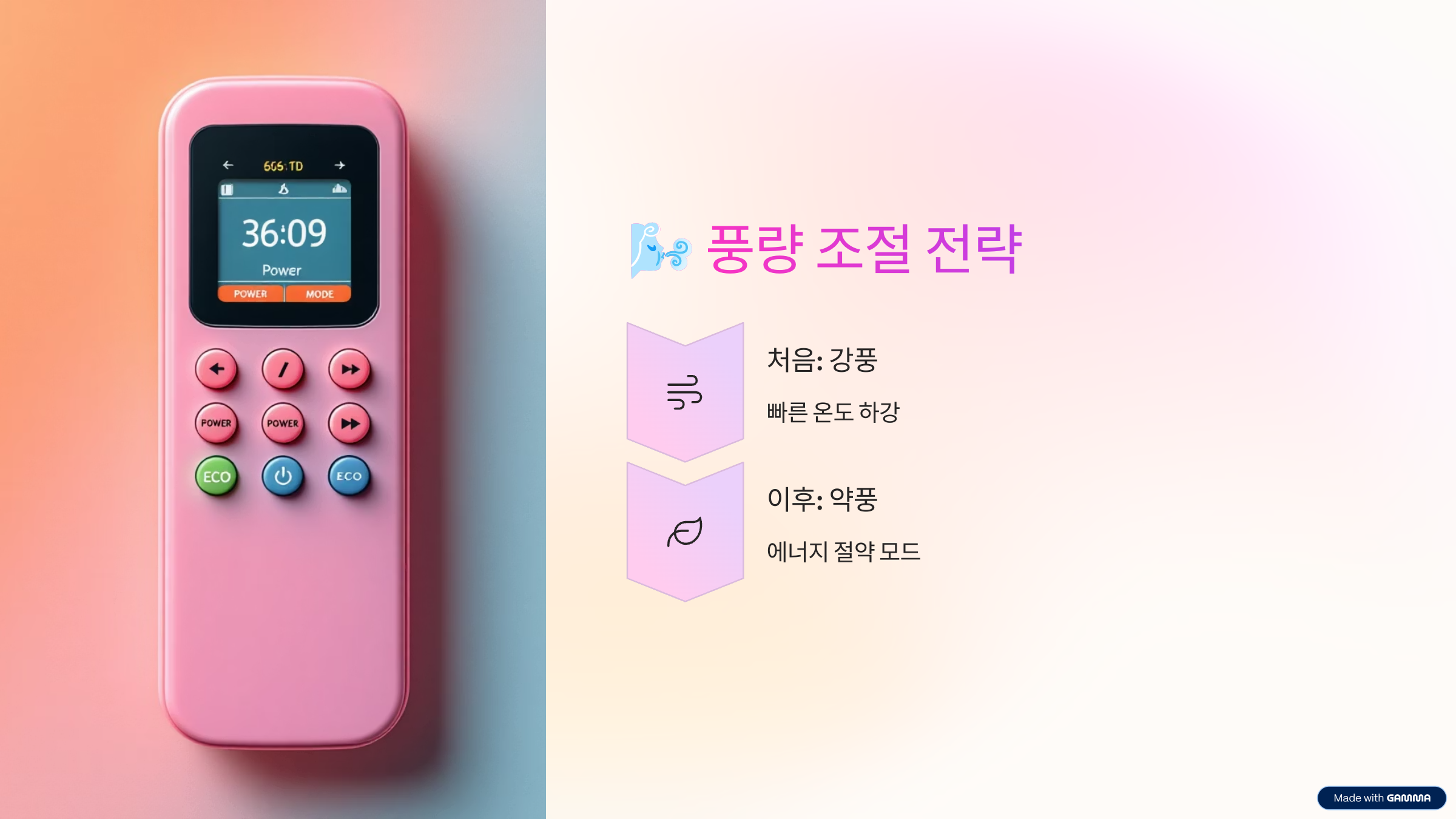 🌀 실내 온도를 빠르게 낮출 때는 강풍 or 파워 냉방으로 시작!