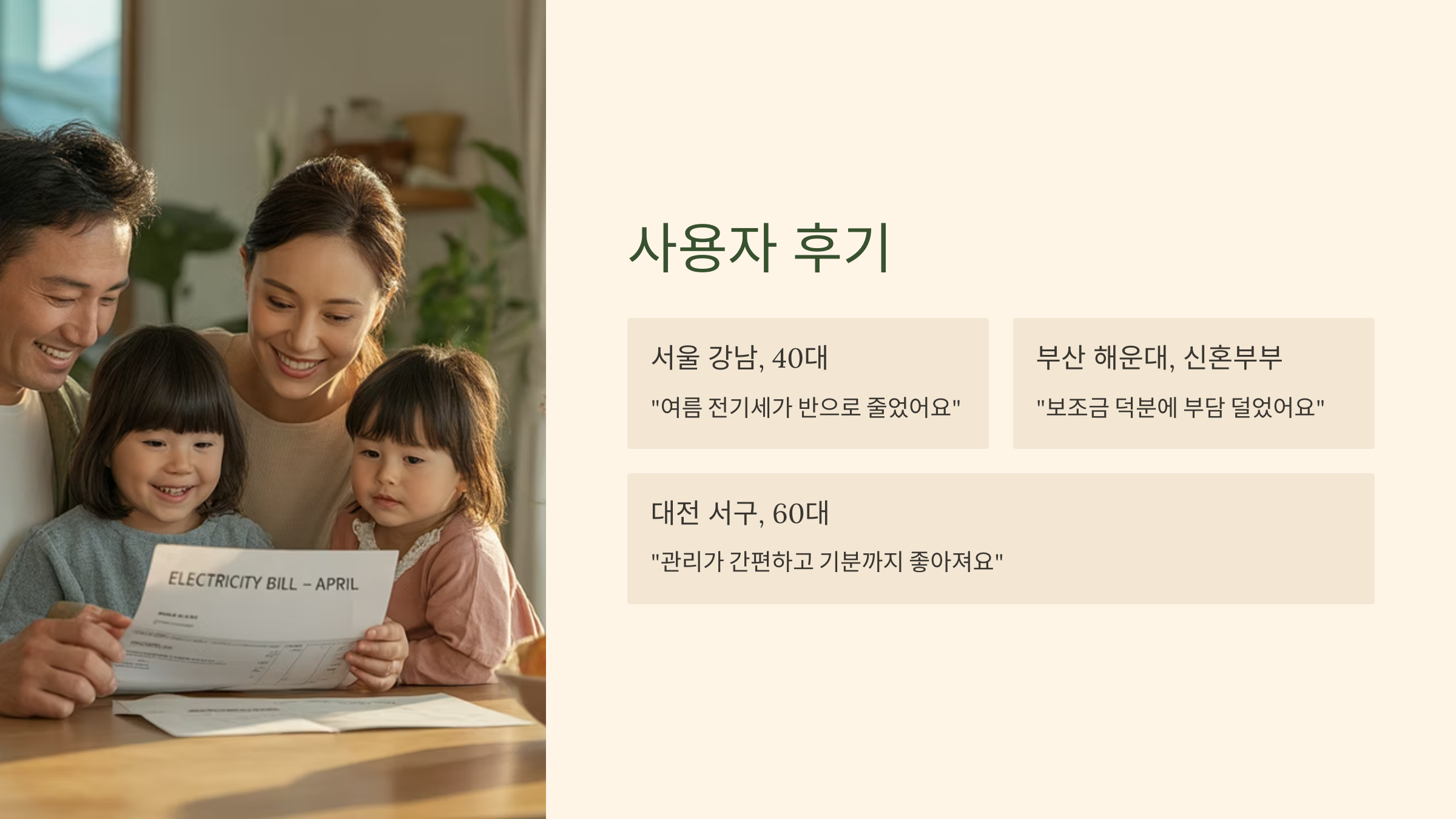 “설치하고 나서 여름 전기세가 반으로 줄었어요. 초기 비용 부담은 있었지만 장기적으로 만족!”