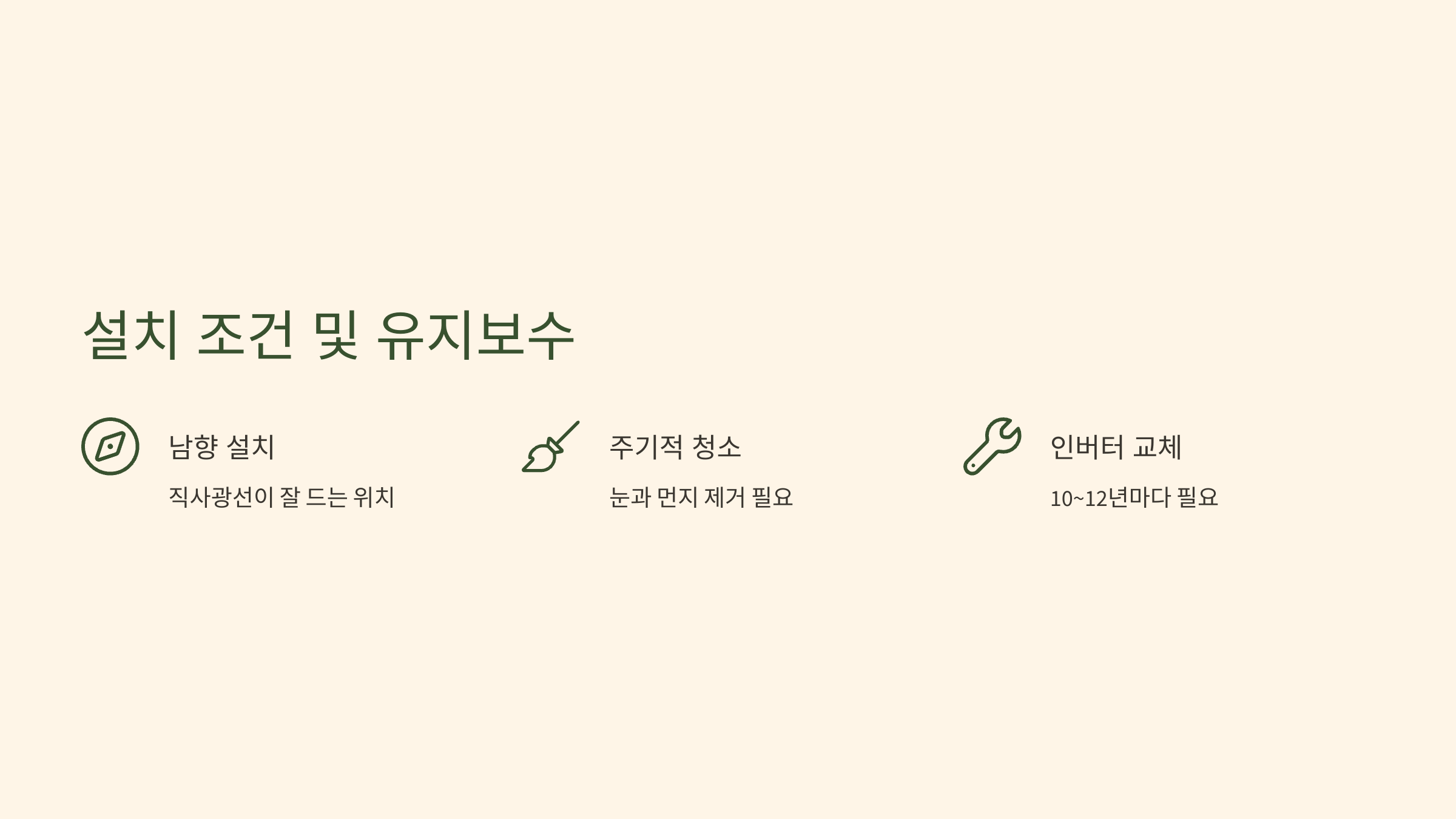 | 🏡 설치조건 | 남향 지붕, 일조량 풍부한 위치 필수 |