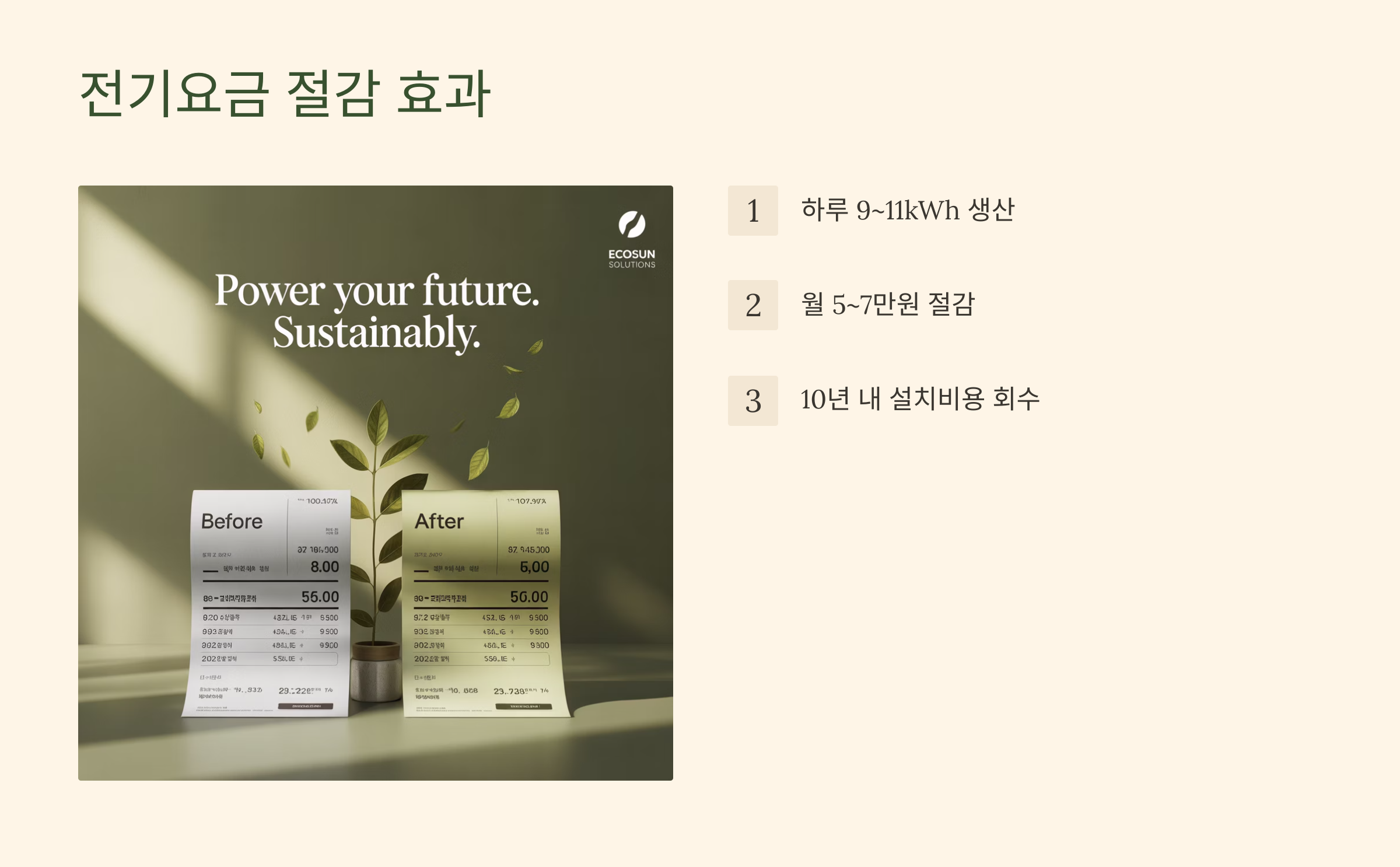 - 월 전기요금 10만 원 가정 → 최대 5~7만 원 절감 가능