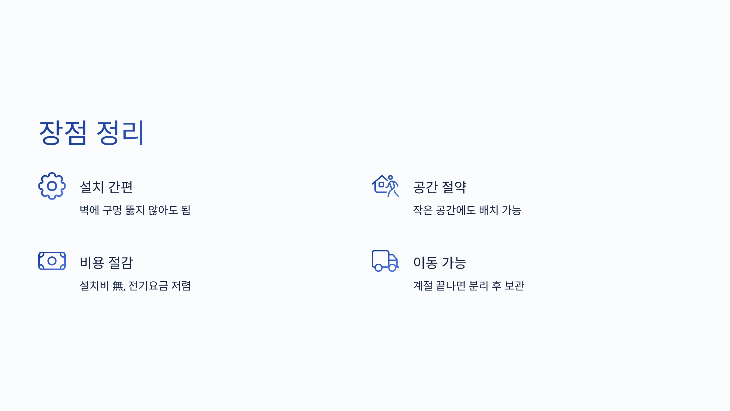 - 기존 벽걸이/스탠드형과 달리 별도 배관이나 실외기 설치가 필요 없어