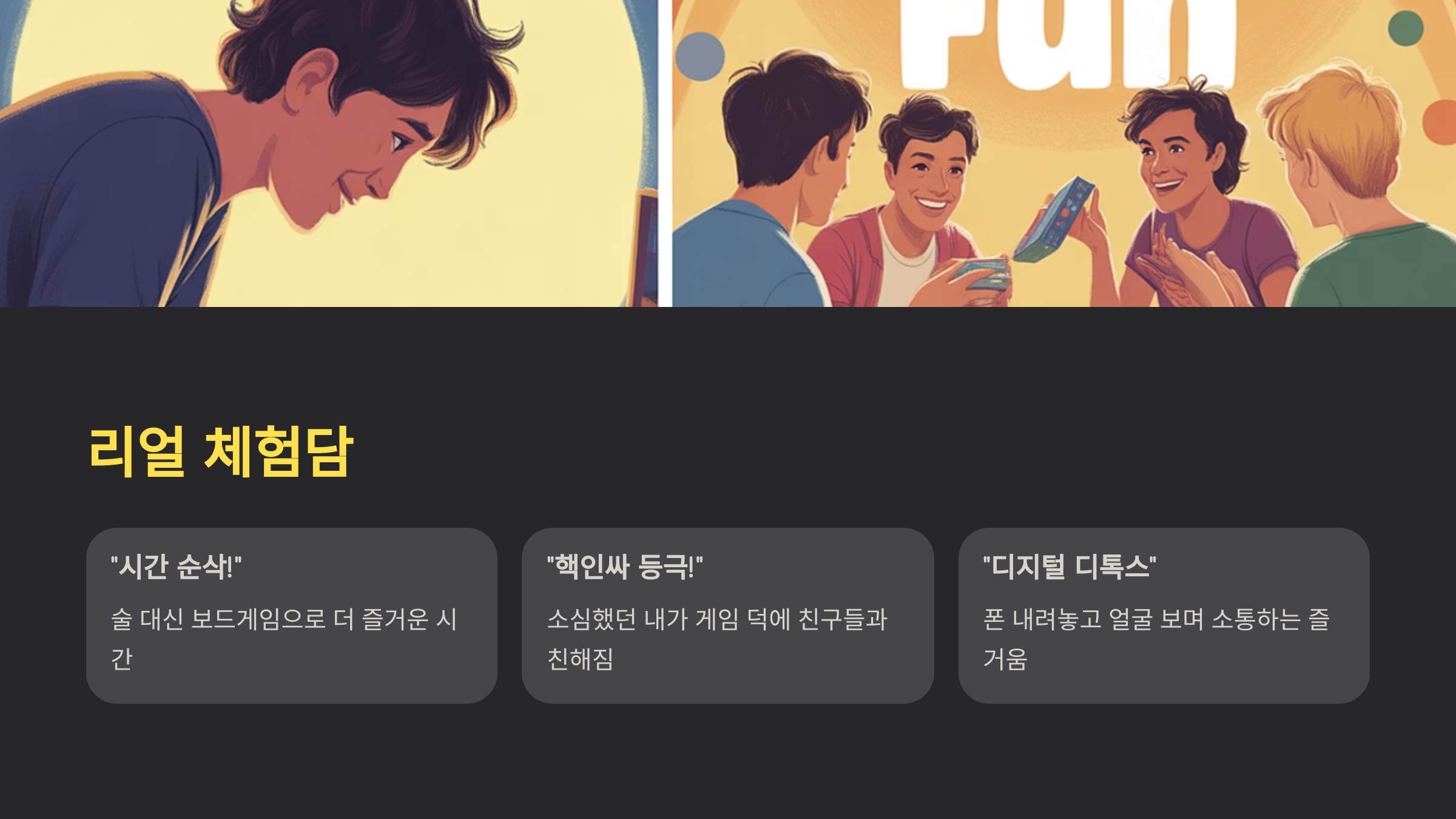 - "스마트폰만 붙잡고 살았는데, 보드게임 시작하고 나서는 다들 폰 내려놓고 게임에 집중해요. 덕분에 디지털 디톡스도 되고, 친구들과 얼굴 보면서 소통할 수 있어서 너무 좋습니다!"