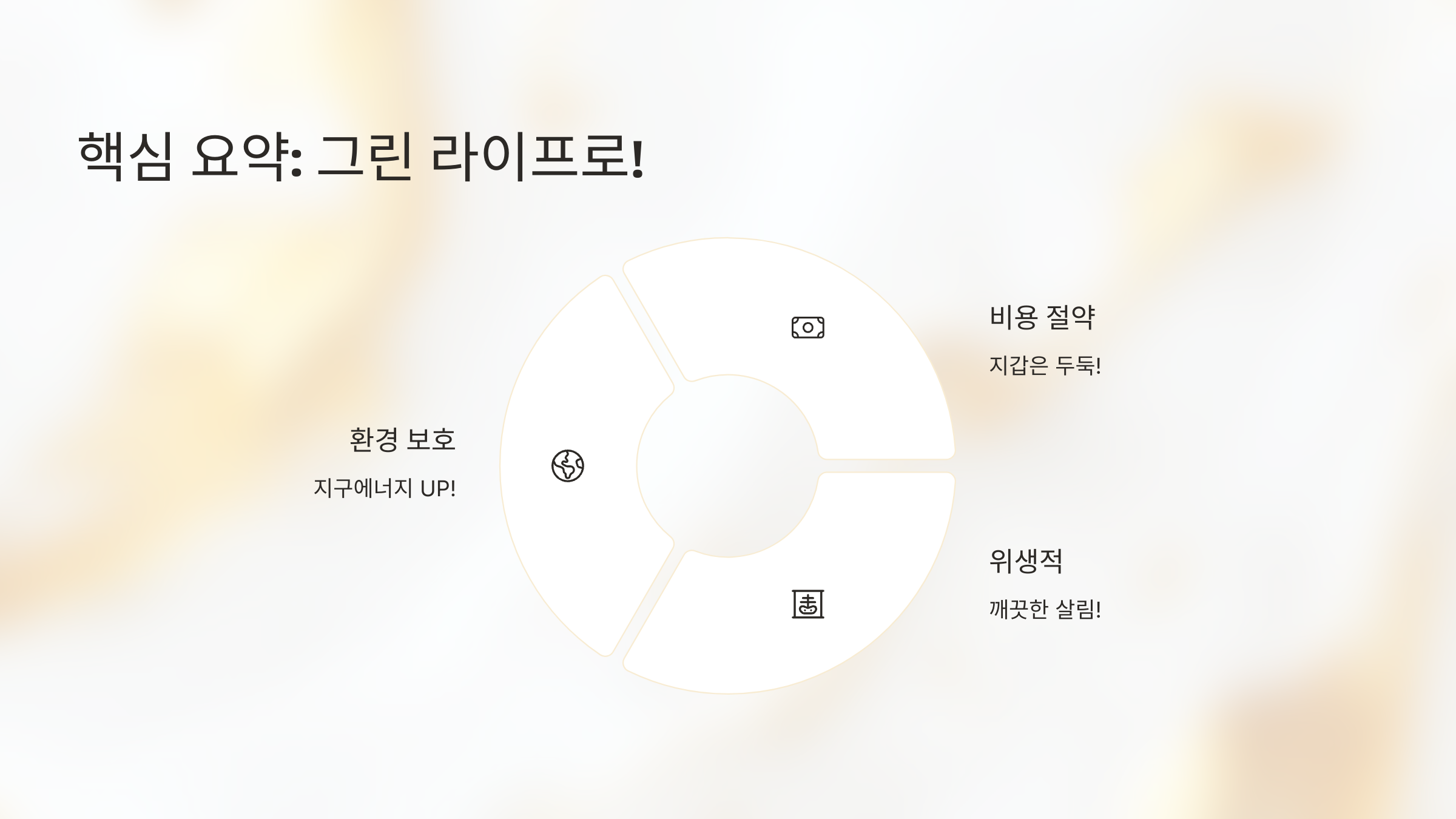 - "물티슈 하나 덜 쓰는 게 뭐 얼마나 영향이 있겠어 싶었는데, 이렇게 매일 꾸준히 하니 저도 지구를 지키는 데 동참하는 것 같아 뿌듯해요. 작은 습관의 힘을 믿습니다!"