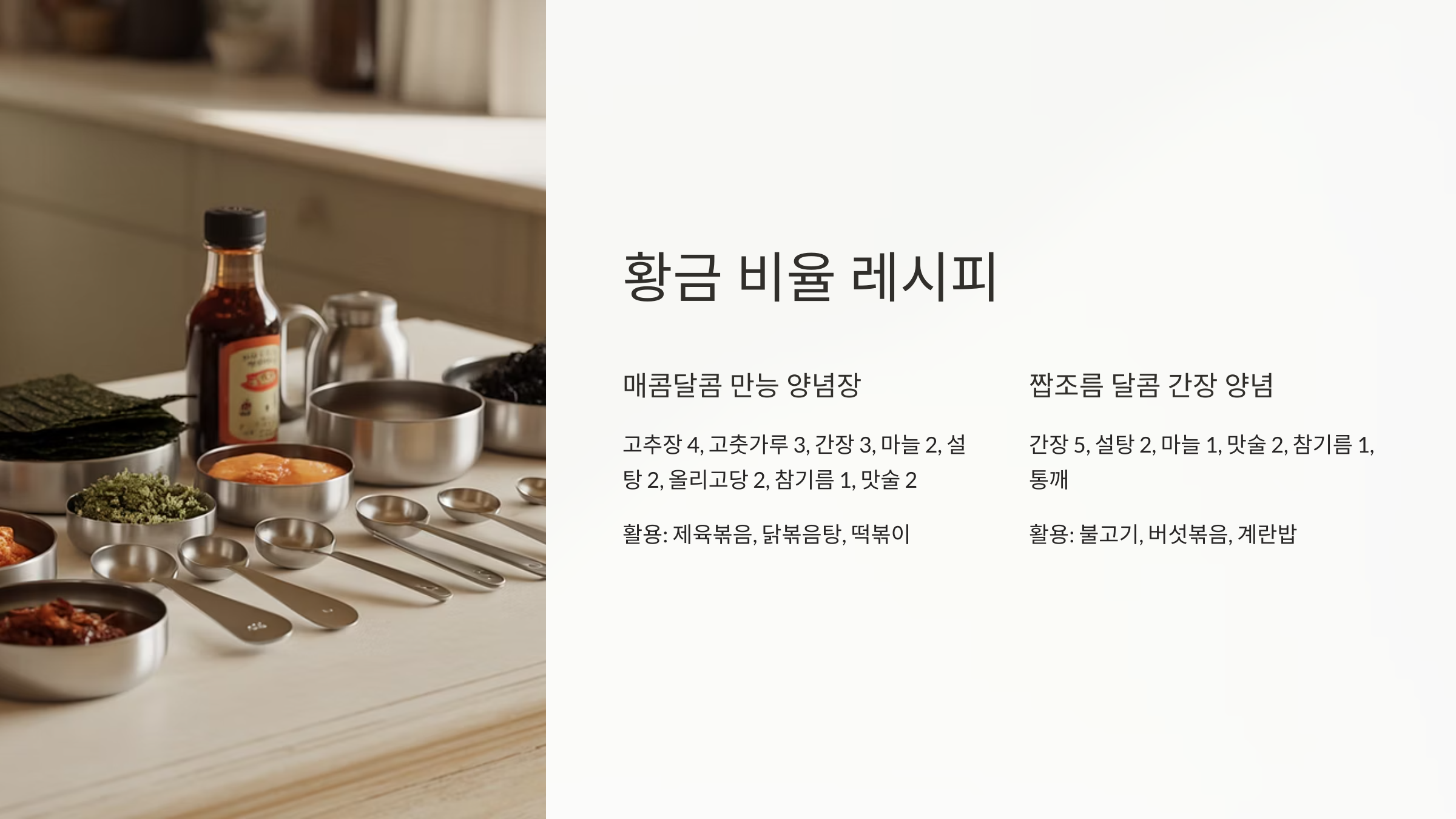 - 🗑️ 식재료 낭비 방지: 애매하게 남는 양념 재료들을 줄일 수 있어요. 한 번 만들어 두면 다양한 요리에 활용할 수 있으니, 냉장고 속 식재료도 더욱 알차게 소비할 수 있습니다.