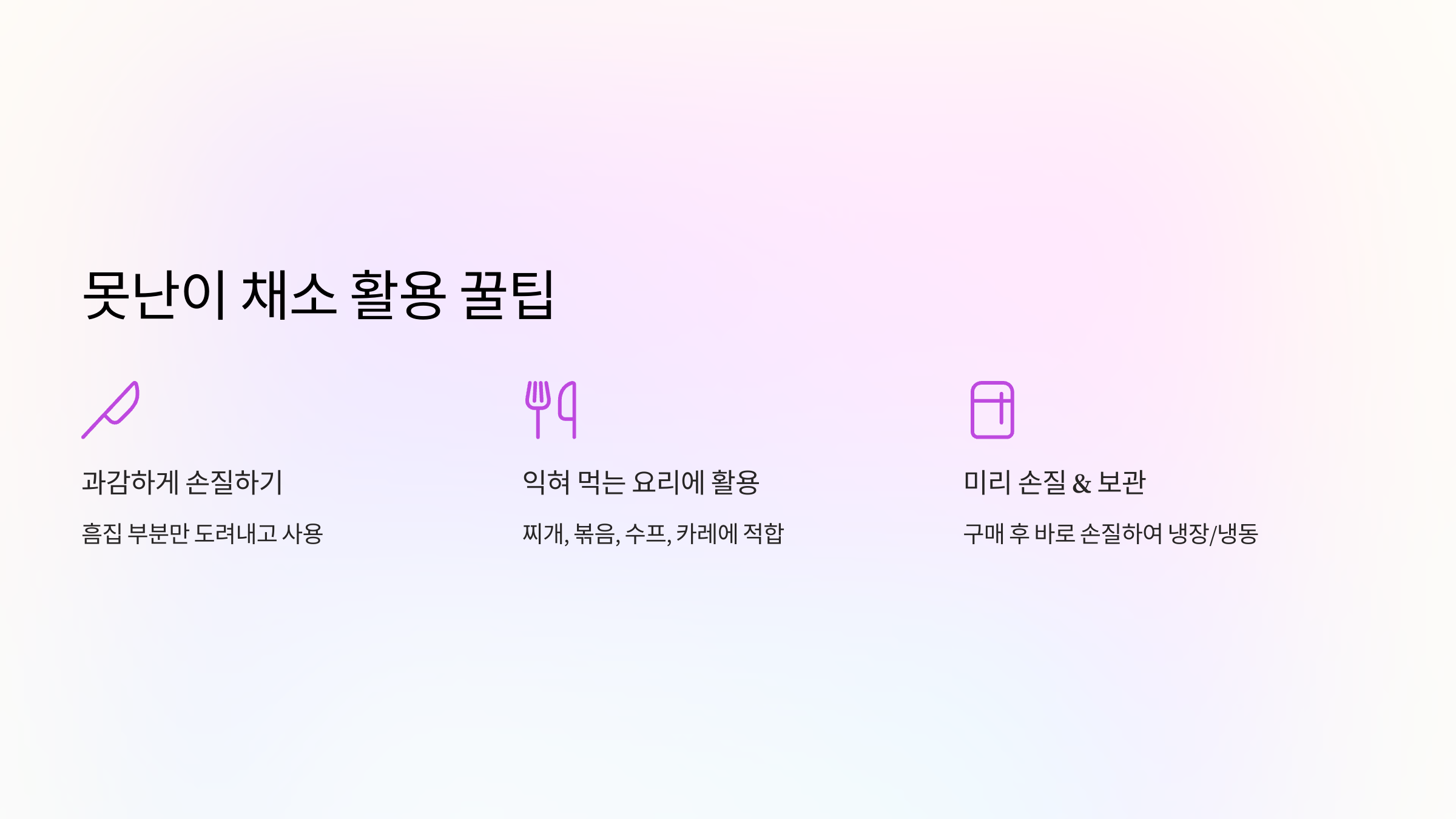 - 익혀 먹는 요리에 활용: 겉모습이 중요한 샐러드보다는 찌개, 볶음, 수프, 카레 등 익혀서 먹는 요리에 활용하면 더욱 만족도가 높아요.