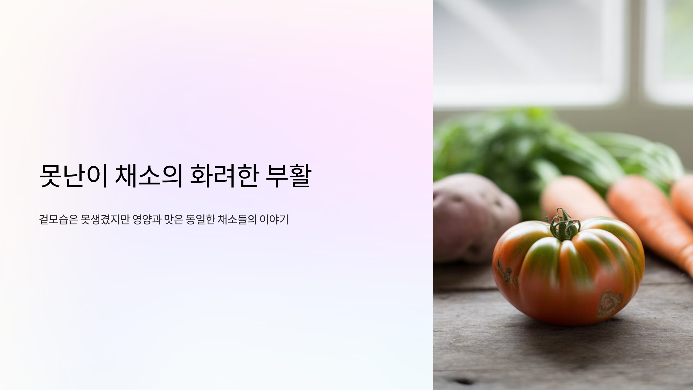 마트에 가면 예쁘고 반듯한 채소들만 쏙쏙 골라 담고 있나요? 🧐 조금 찌그러지거나, 구부러지거나, 흠집이 있다고 외면받는 **'못난이 채소'**들이 있어요. 하지만 아세요? 겉모습은 못생겼을지라도 영양도 맛도 예쁜 채소와 똑같다는 사실! 심지어 가격은 훨씬 저렴하답니다. 💸 오늘은 버려질 뻔한 못난이 채소들을 구원하고, 우리의 식탁을 풍성하게 채워줄 못생긴 채소 활용 요리 레시피와 꿀팁을 대방출할게요. 이 글을 읽고 나면 당신의 장바구니가 달라질 거예요! 🤩