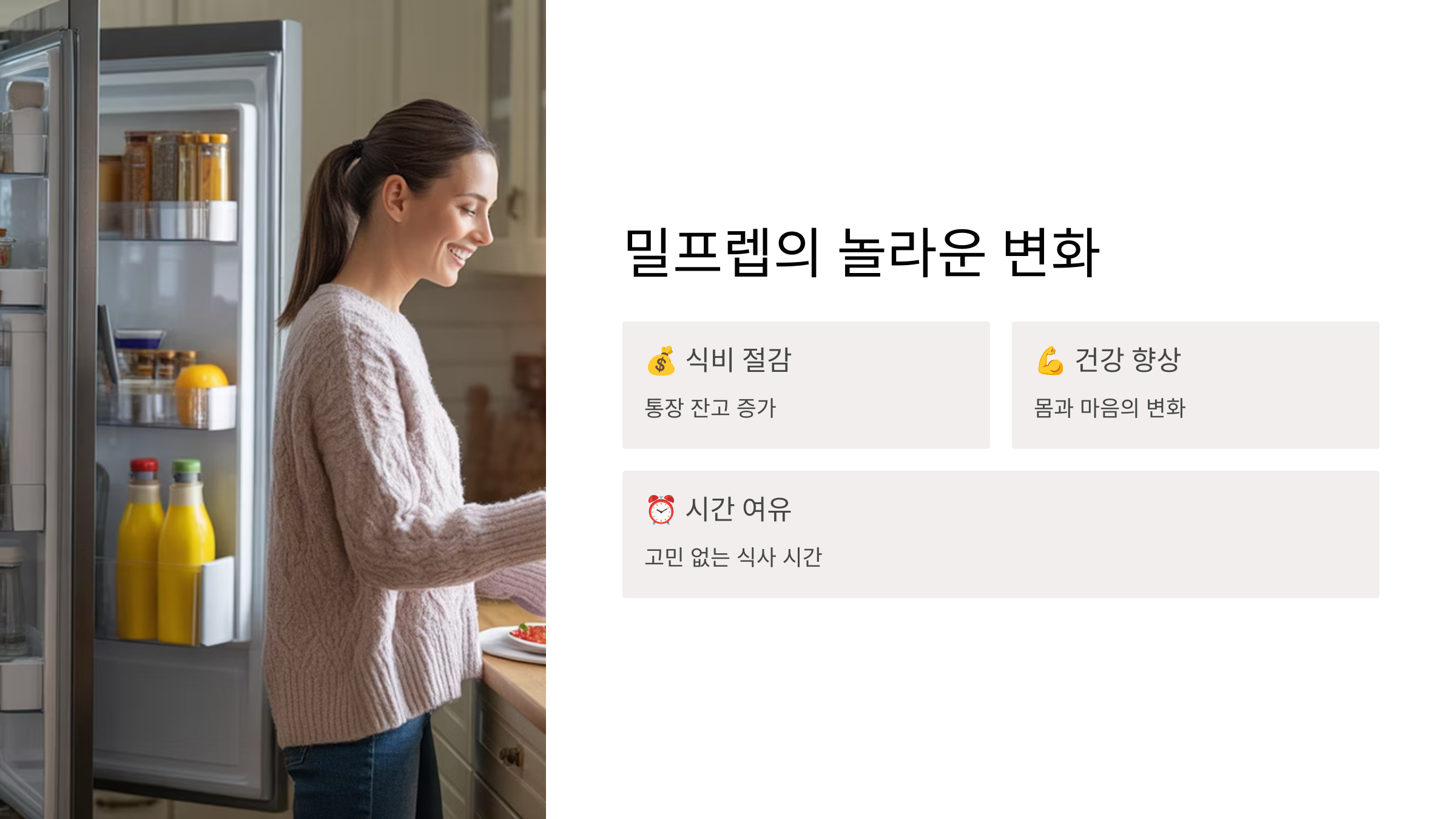 - ⏰ 시간이 절약돼요!: 매일 아침, 점심, 저녁마다 "뭐 먹지?" 고민할 필요가 없어요. 요리 시간도 대폭 줄어들어 여유로운 평일을 보낼 수 있답니다.