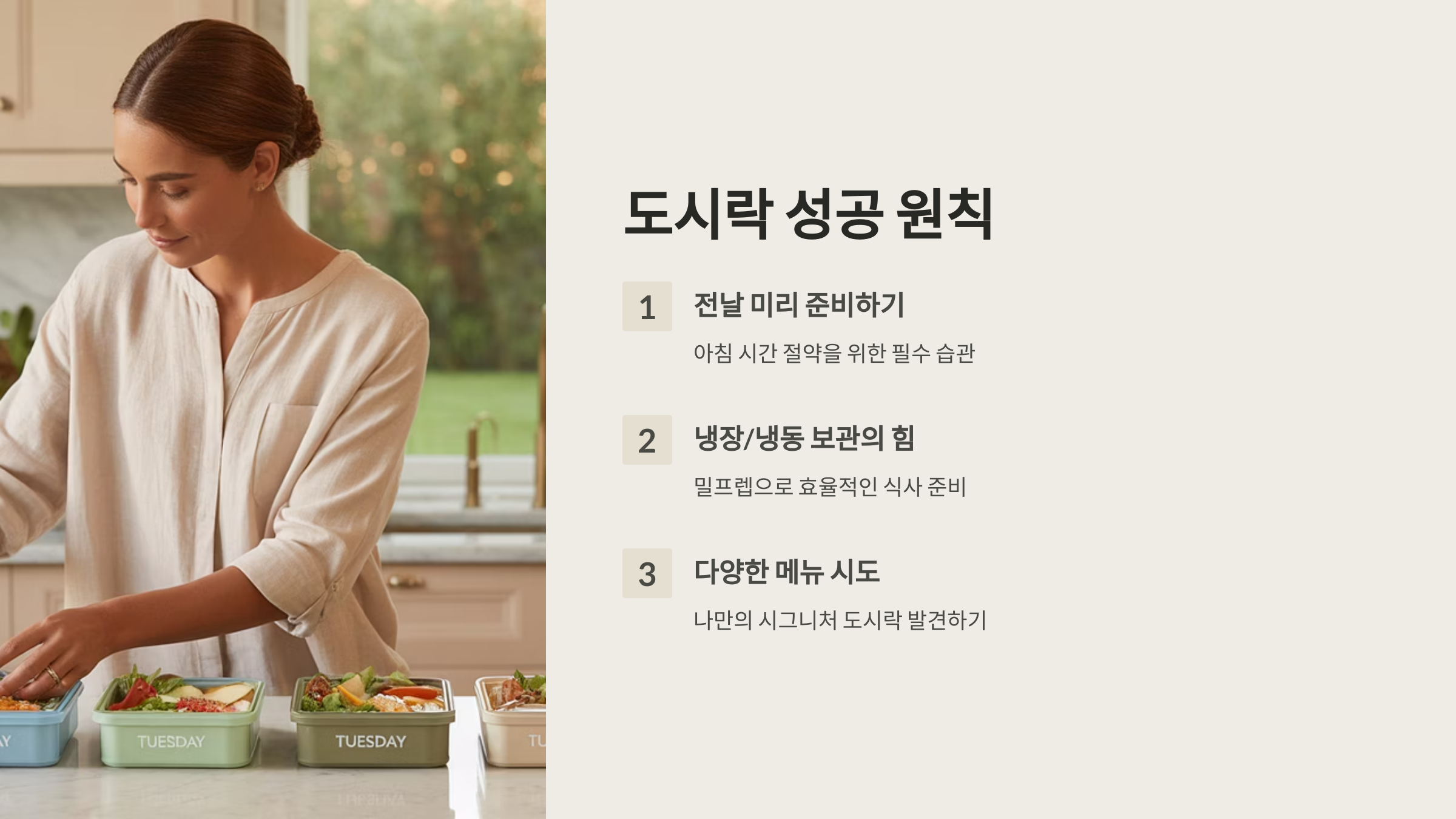도시락 싸기는 생각보다 어렵지 않아요. 몇 가지 원칙만 기억하면 성공적인 도시락 라이프를 즐길 수 있습니다.